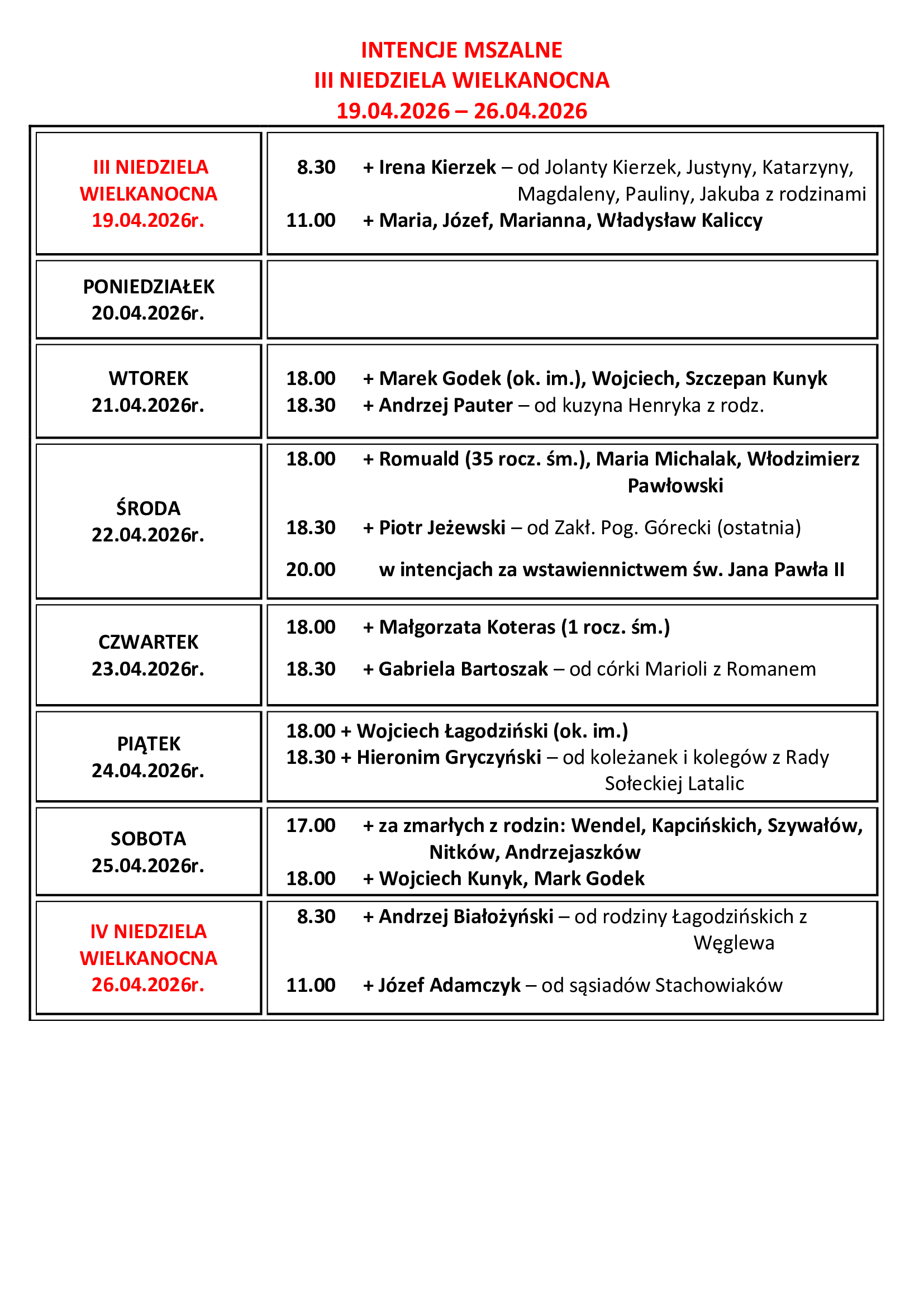 INTENCJE MSZALNE III NIEDZIELA WIELKANOCNA 19.04.2026 – 26.04.2026