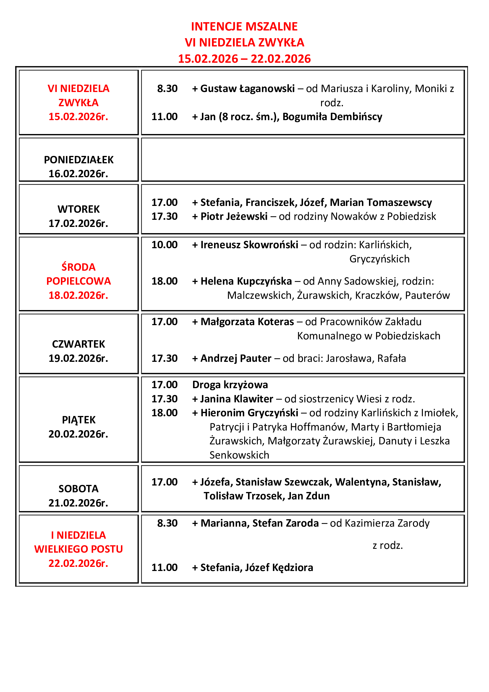 INTENCJE MSZALNE VI NIEDZIELA ZWYKŁA 15.02.2026 – 22.02.2026