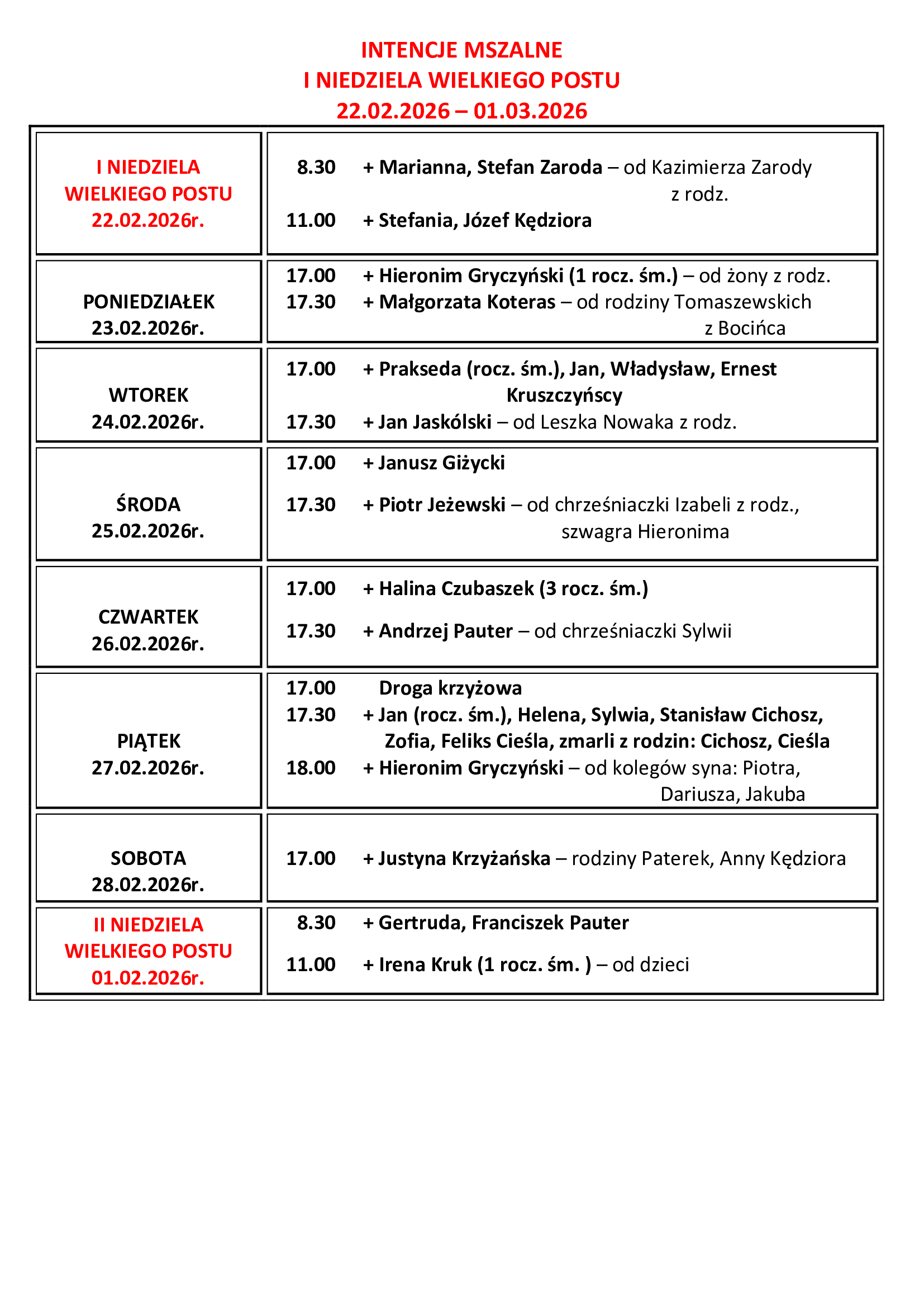 INTENCJE MSZALNE I NIEDZIELA WIELKIEGO POSTU 22.02.2026 – 01.03.2026