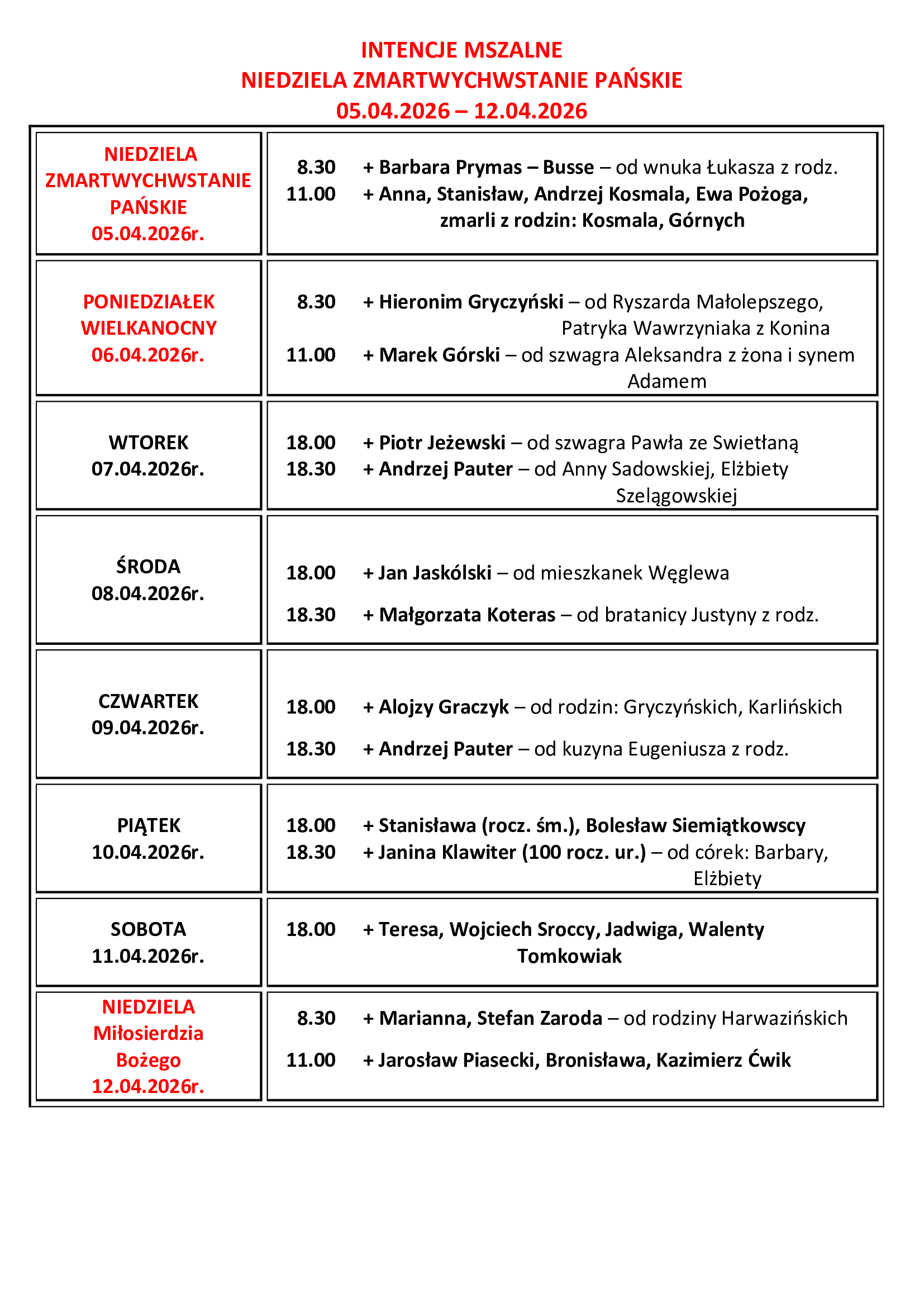 INTENCJE MSZALNE NIEDZIELA ZMARTWYCHWSTANIE PAŃSKIE 05.04.2026 – 12.04.2026