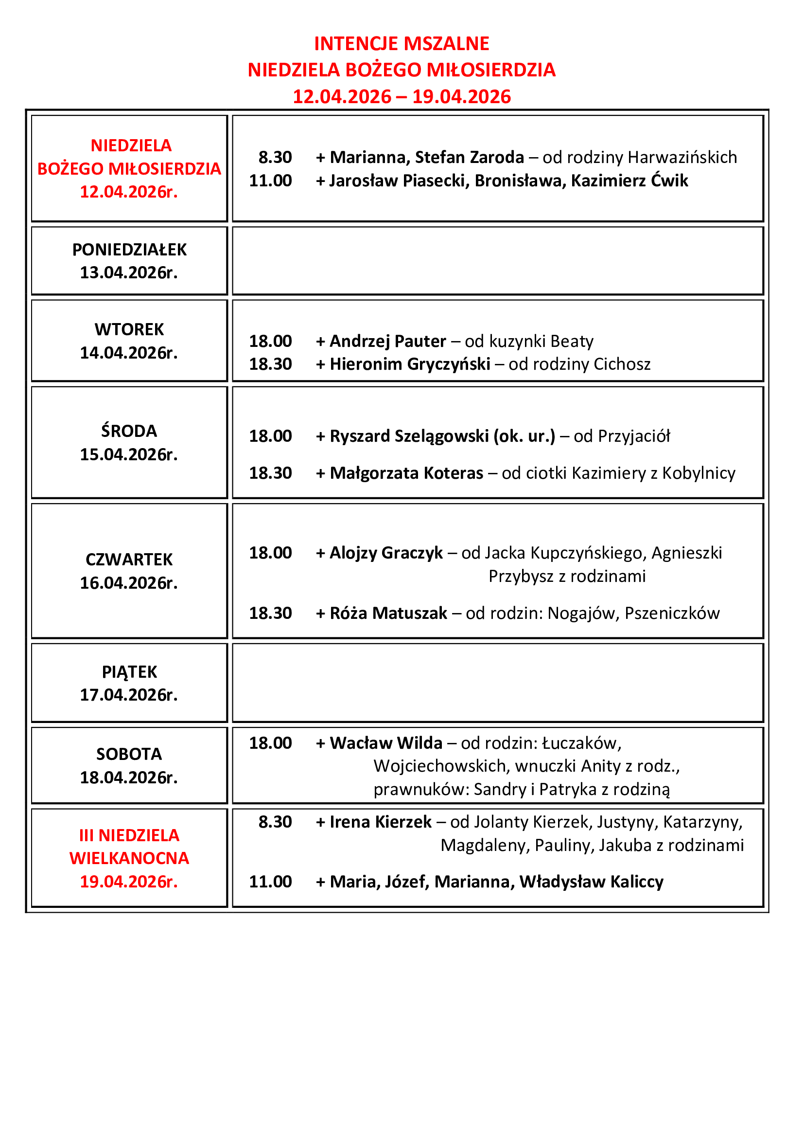 INTENCJE MSZALNE NIEDZIELA BOŻEGO MIŁOSIERDZIA 12.04.2026 – 19.04.2026