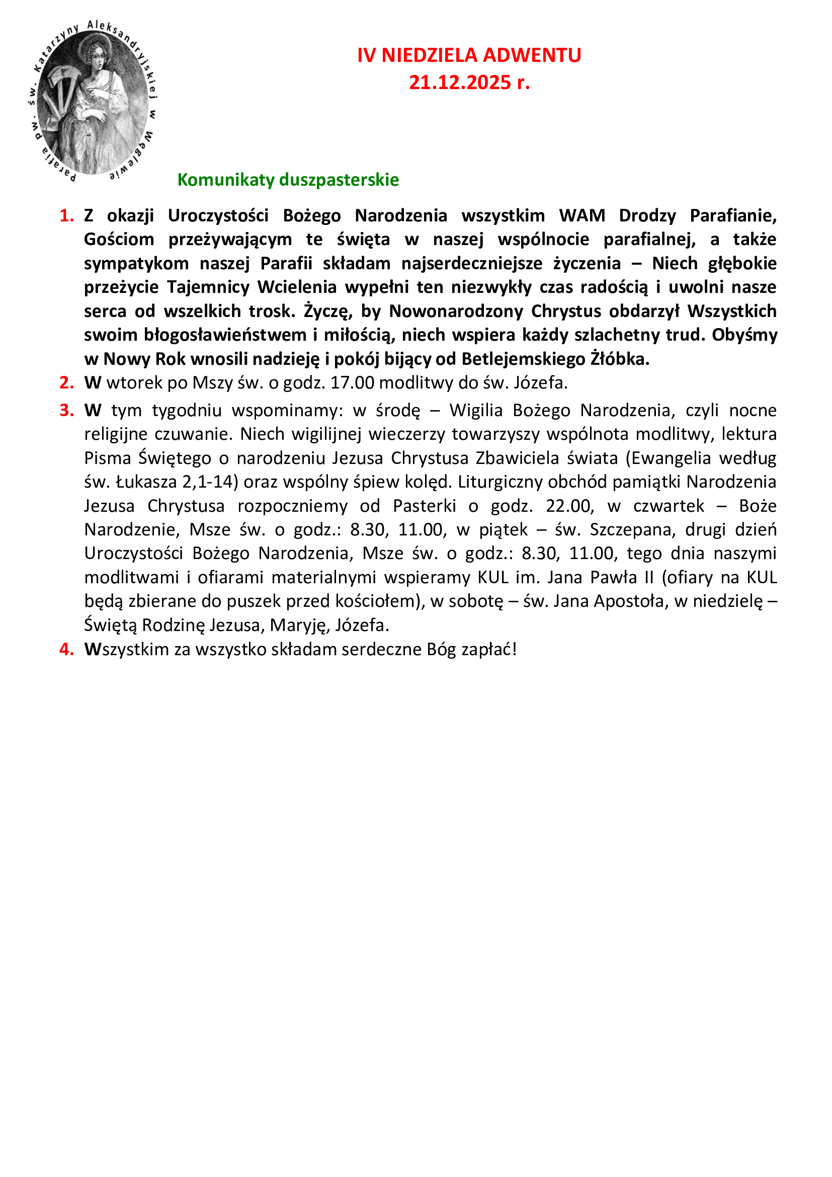 IV NIEDZIELA ADWENTU 21.12.2025 r.