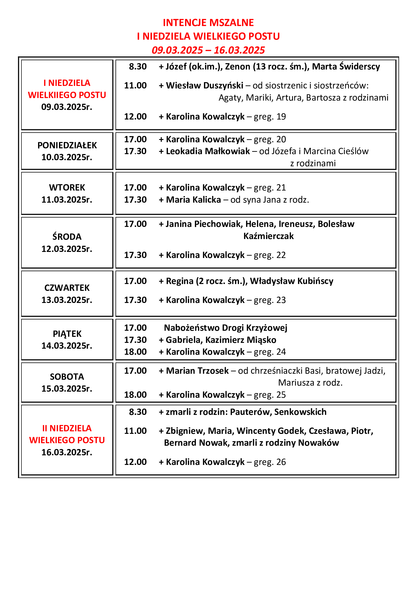 INTENCJE MSZALNE I NIEDZIELA WIELKIEGO POSTU 09.03.2025 – 16.03.2025