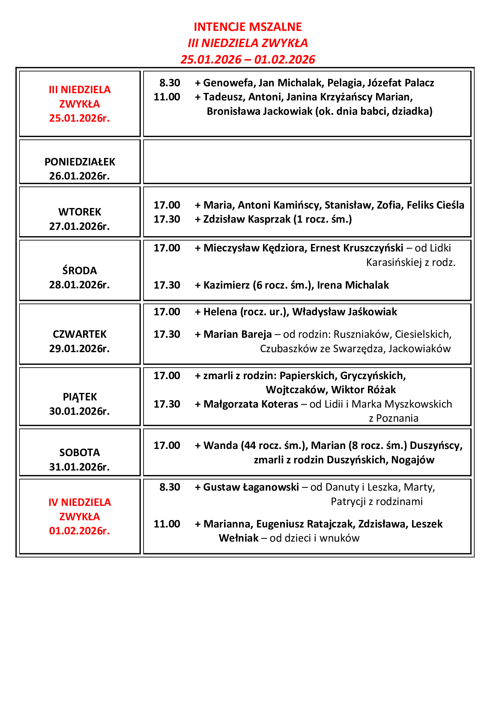 INTENCJE MSZALNE III NIEDZIELA ZWYKŁA 25.01.2026 – 01.02.2026
