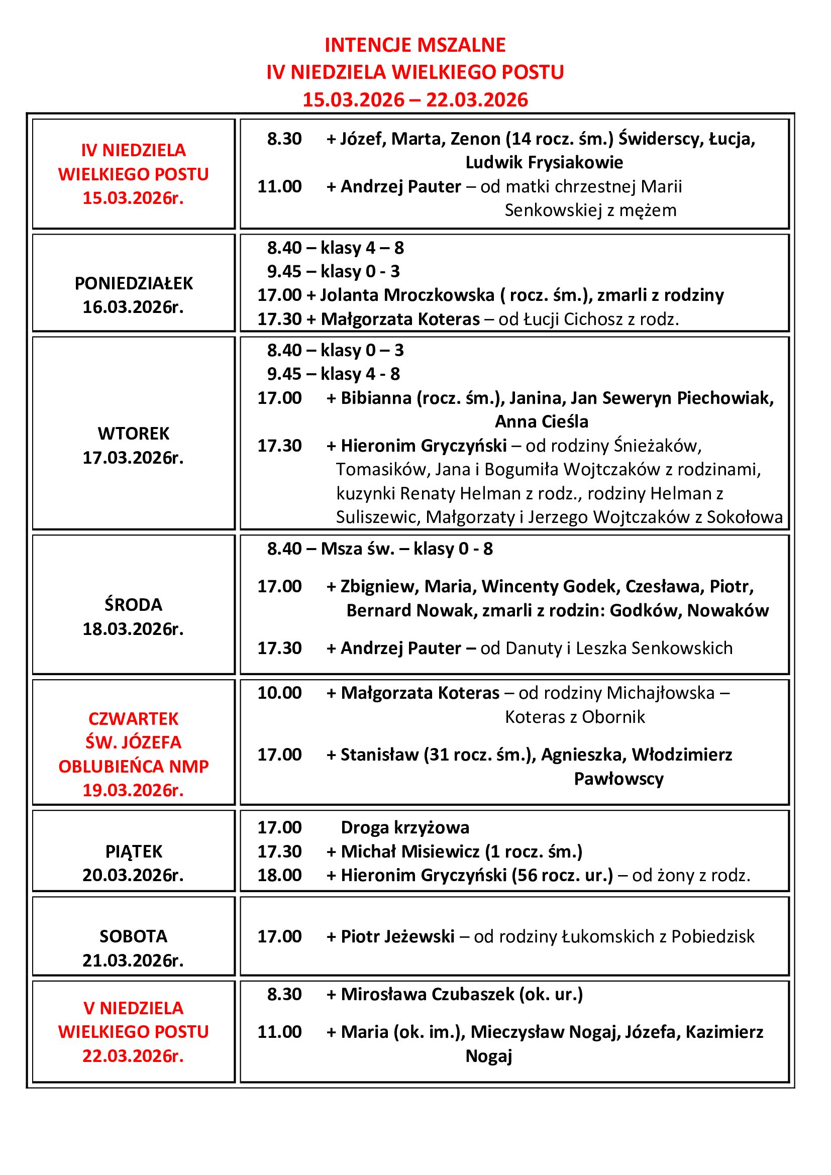 INTENCJE MSZALNE IV NIEDZIELA WIELKIEGO POSTU 15.03.2026 – 22.03.2026