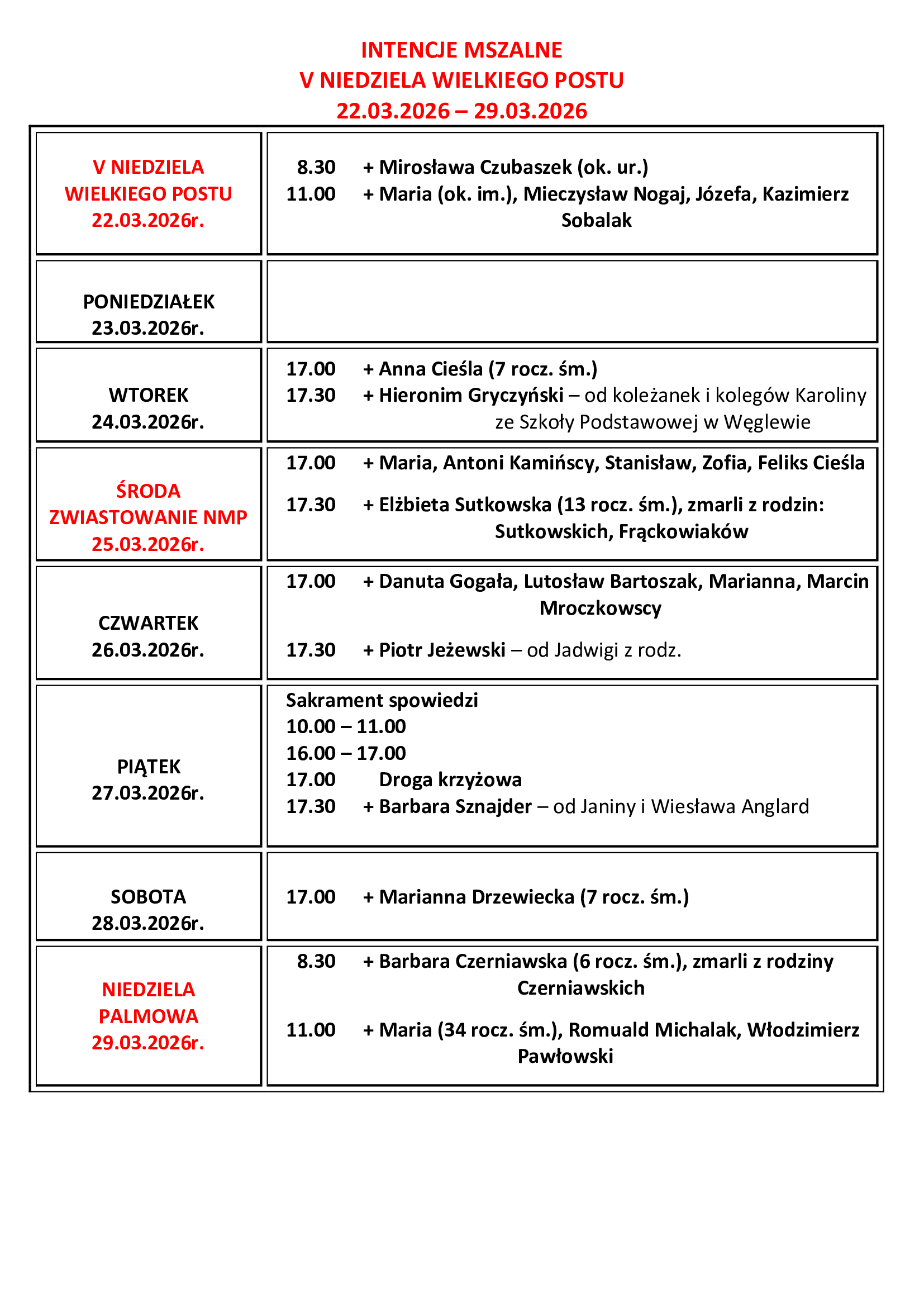 INTENCJE MSZALNE V NIEDZIELA WIELKIEGO POSTU 22.03.2026 – 29.03.2026