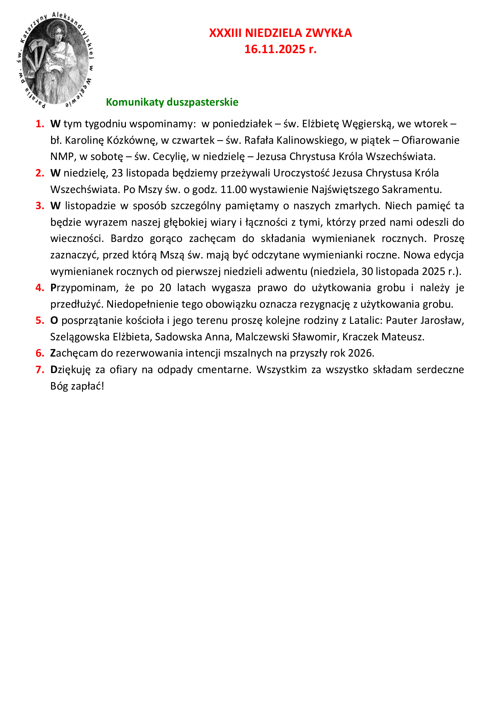 XXXIII NIEDZIELA ZWYKŁA 16.11.2025 r.