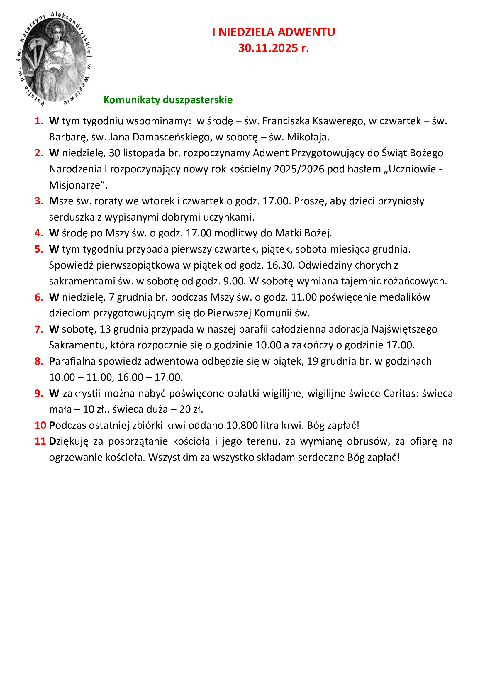 I NIEDZIELA ADWENTU 30.11.2025 r.