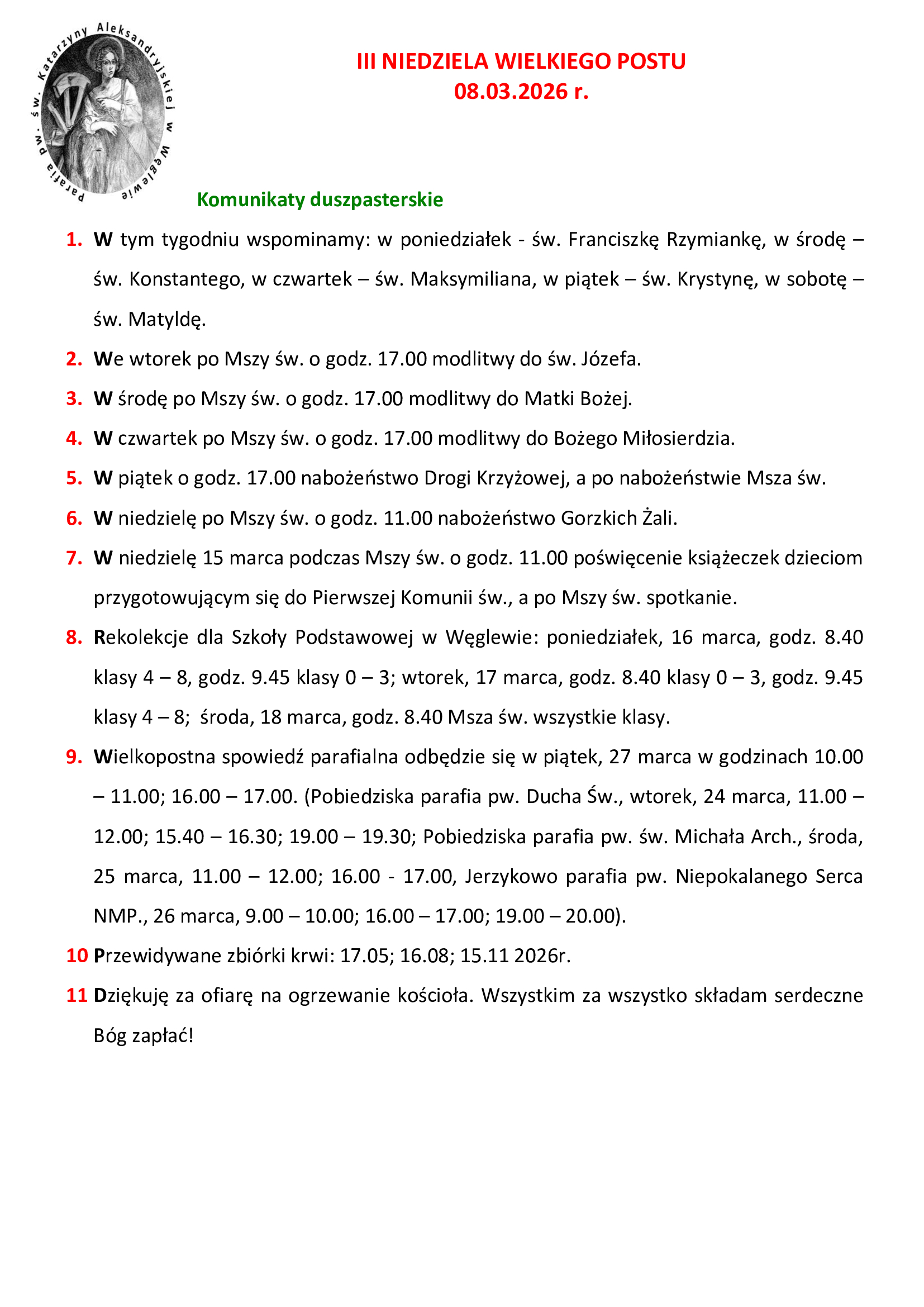 III NIEDZIELA WIELKIEGO POSTU 08.03.2026 r.