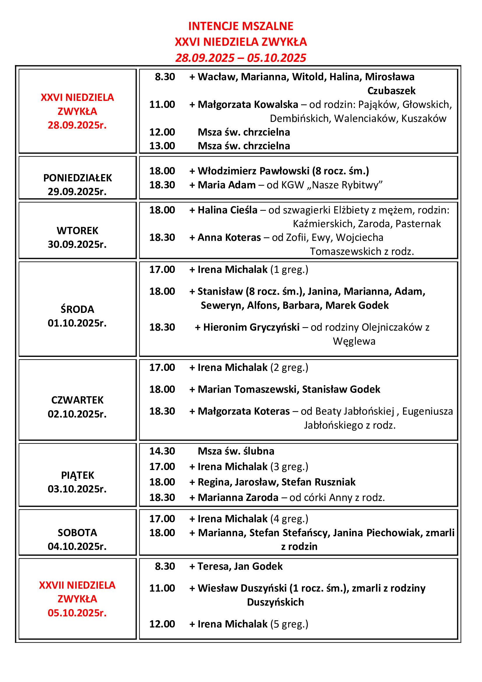 INTENCJE MSZALNE XXVI NIEDZIELA ZWYKŁA 28.09.2025 – 05.10.2025