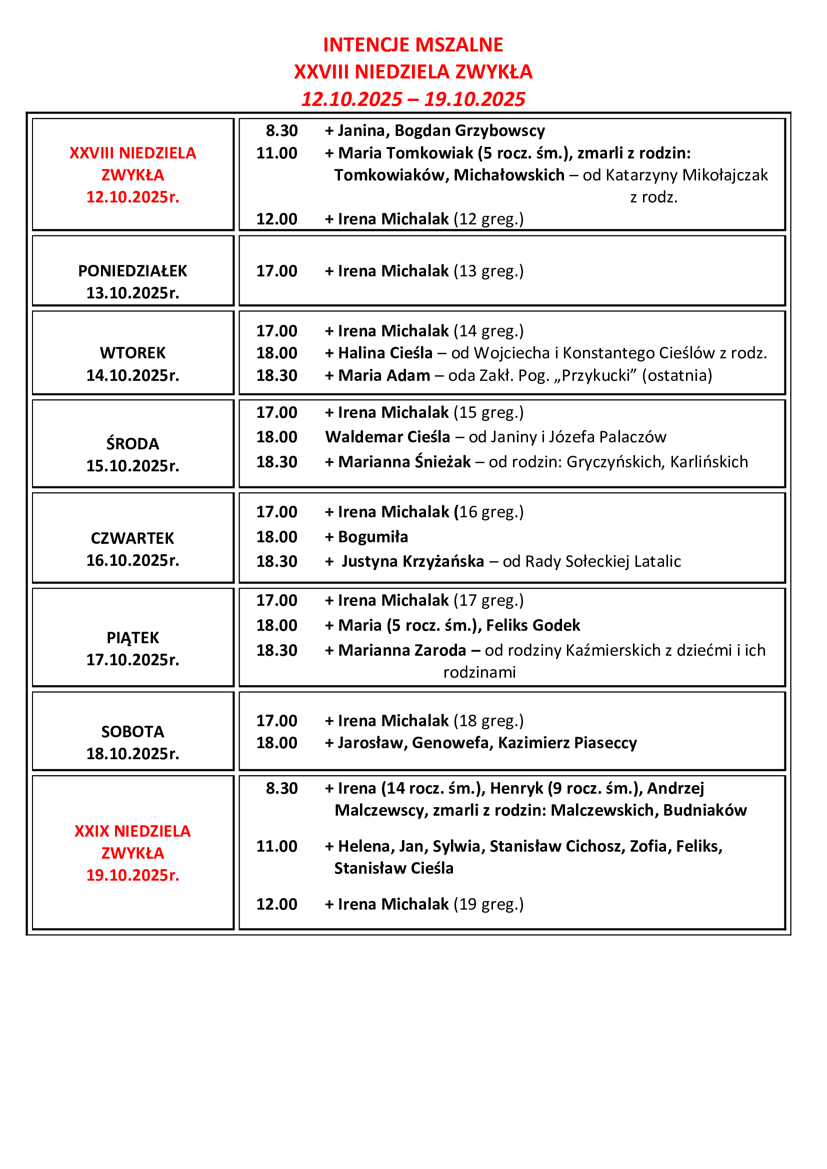 INTENCJE MSZALNE XXVIII NIEDZIELA ZWYKŁA 12.10.2025 – 19.10.2025