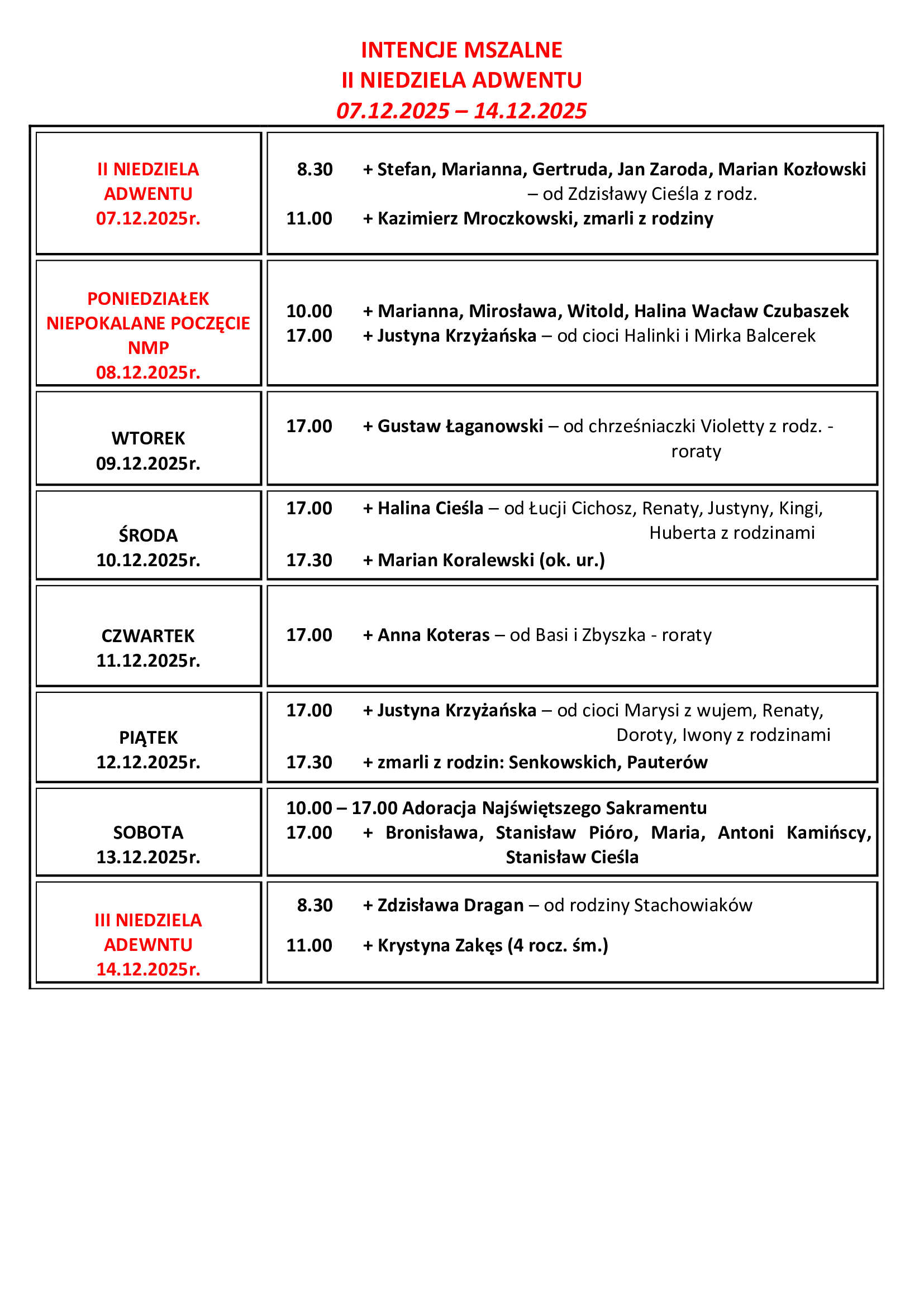 INTENCJE MSZALNE II NIEDZIELA ADWENTU 07.12.2025 – 14.12.2025