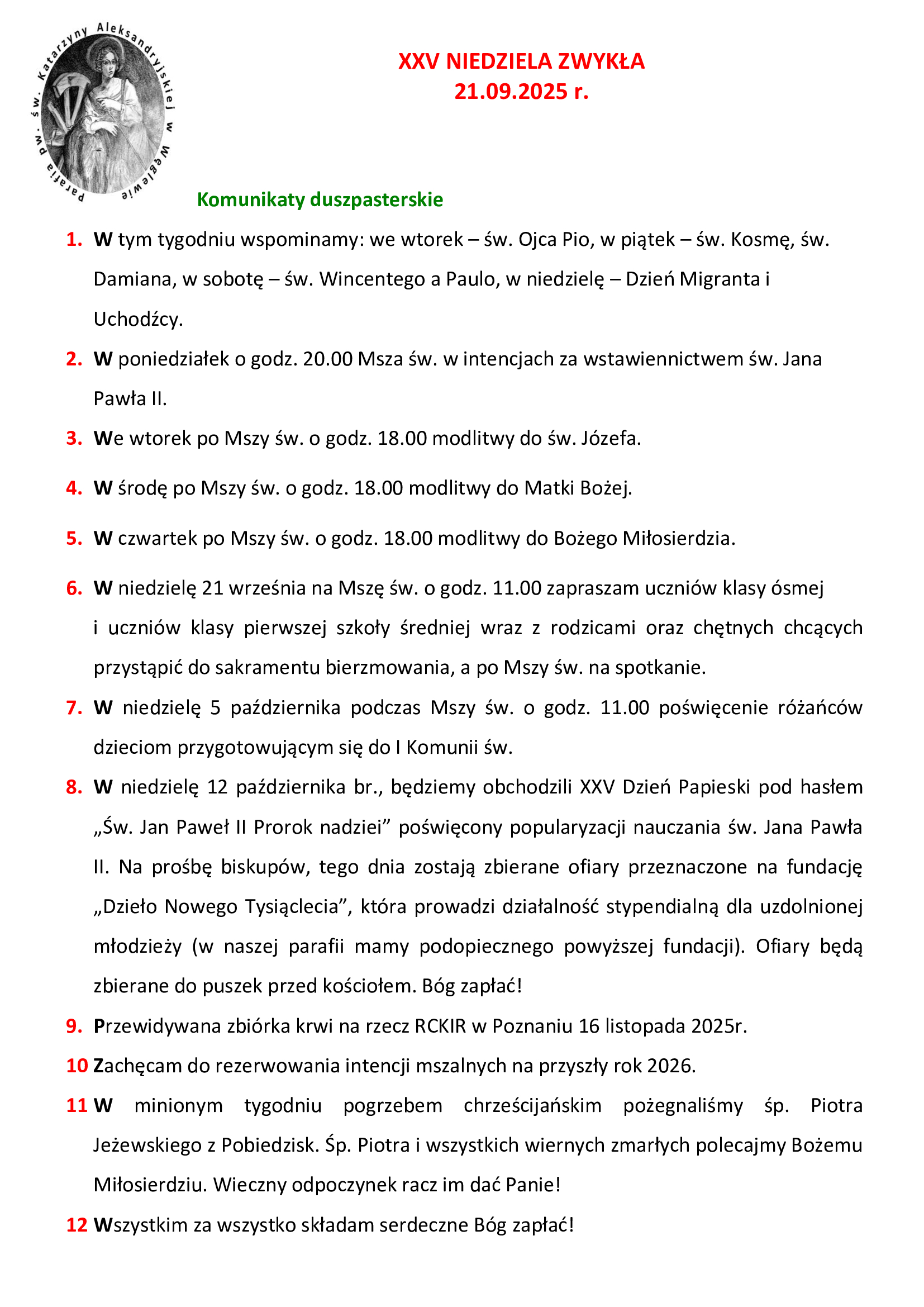 XXV NIEDZIELA ZWYKŁA 21.09.2025 r.